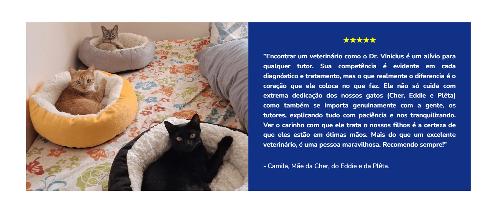 Vasto conhecimento em diversas áreas da clínica de cães e gatos.